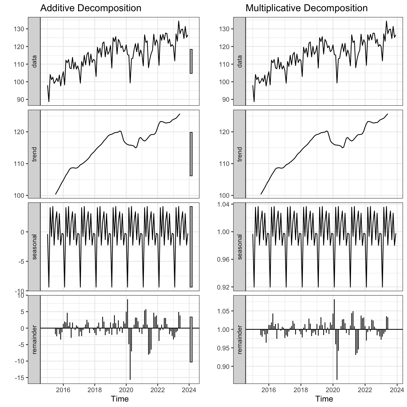 If seasonal fluctuations grow proportionally with the level of the series → use multiplicative. If they remain roughly constant → use additive.