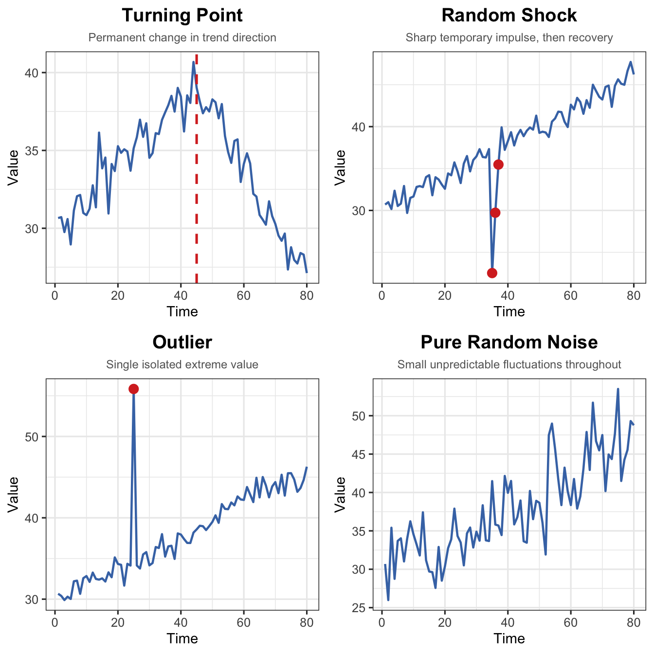 Turning point vs. Random Shock: A turning point results in a permanent direction change. After a random shock, the series recovers toward its previous level.