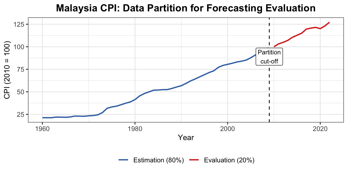 cpi <-read.csv("data/CPI Malaysia.csv", check.names =FALSE)cpits <-ts(cpi$`Consumer price index (2010 = 100)`,start =1960, frequency =1)est_part <-head(cpits, 0.8*length(cpits))eva_part <-tail(cpits, 0.2*length(cpits))str(est_part)