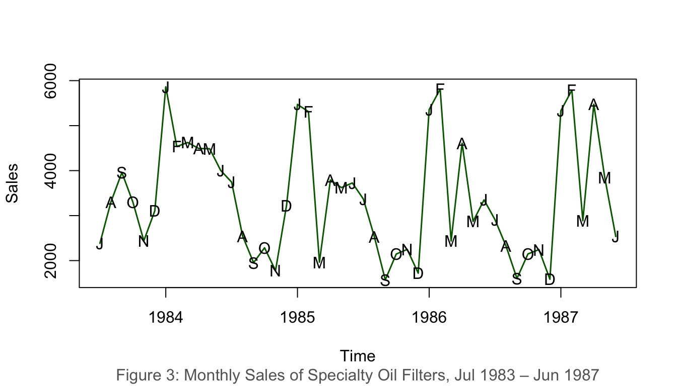 data(oilfilters)plot(oilfilters, type ="l", ylab ="Sales", col ="darkgreen", lwd =1.5)points(y = oilfilters, x =time(oilfilters),pch =as.vector(season(oilfilters)))title(sub ="Figure 3: Monthly Sales of Specialty Oil Filters, Jul 1983 – Jun 1987",col.sub ="grey40")
