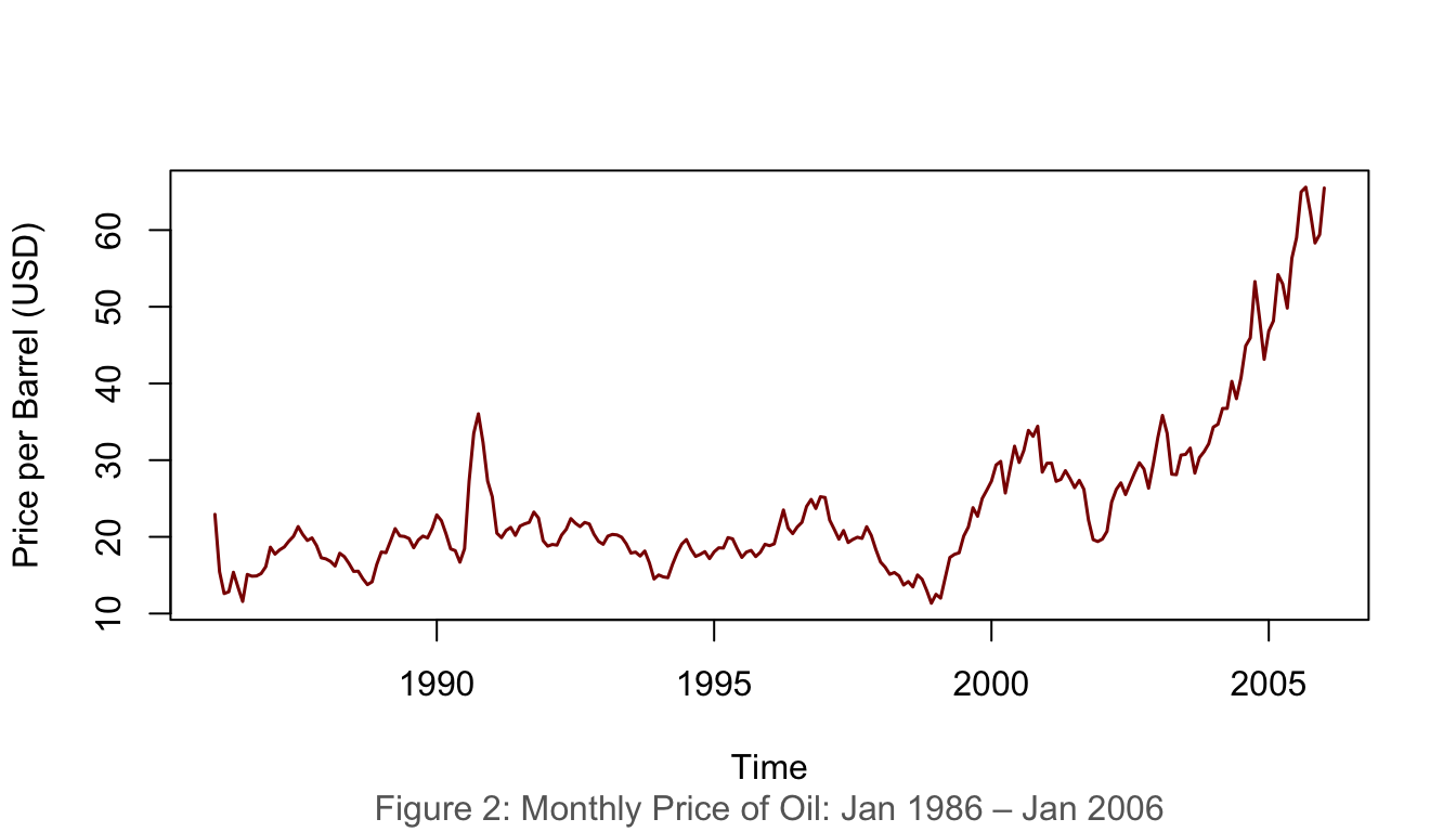 data(oil.price)plot(oil.price, ylab ="Price per Barrel (USD)", type ="l",col ="darkred", lwd =1.5)title(sub ="Figure 2: Monthly Price of Oil: Jan 1986 – Jan 2006",col.sub ="grey40")