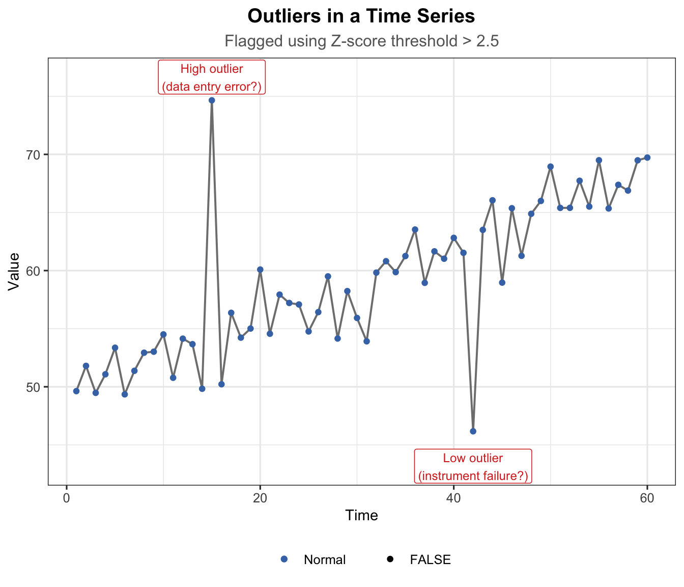 t_out <-1:60y_out <-50+0.3* t_out +rnorm(60, 0, 2)# Inject outliersy_out[15] <- y_out[15] +20# high outliery_out[42] <- y_out[42] -18# low outlier# Z-score to flag outliersz_scores <-abs(scale(y_out))is_outlier <- z_scores >2.5df_out <-data.frame(t = t_out, y = y_out, outlier =as.vector(is_outlier))ggplot(df_out, aes(x = t, y = y)) +geom_line(colour ="grey50", linewidth =0.7) +geom_point(aes(colour = outlier, size = outlier)) +scale_colour_manual(values =c("FALSE"="#4575b4", "TRUE"="#d73027"),labels =c("FALSE"="Normal", "TRUE"="Outlier")) +scale_size_manual(values =c("FALSE"=1.5, "TRUE"=3.5)) +annotate("label", x =15, y = y_out[15] +2,label ="High outlier\n(data entry error?)",colour ="#d73027", fill ="white", size =3.2, label.size =0.3) +annotate("label", x =42, y = y_out[42] -3,label ="Low outlier\n(instrument failure?)",colour ="#d73027", fill ="white", size =3.2, label.size =0.3) +labs(title ="Outliers in a Time Series",subtitle ="Flagged using Z-score threshold > 2.5",x ="Time", y ="Value", colour =NULL, size =NULL) +theme_ts()