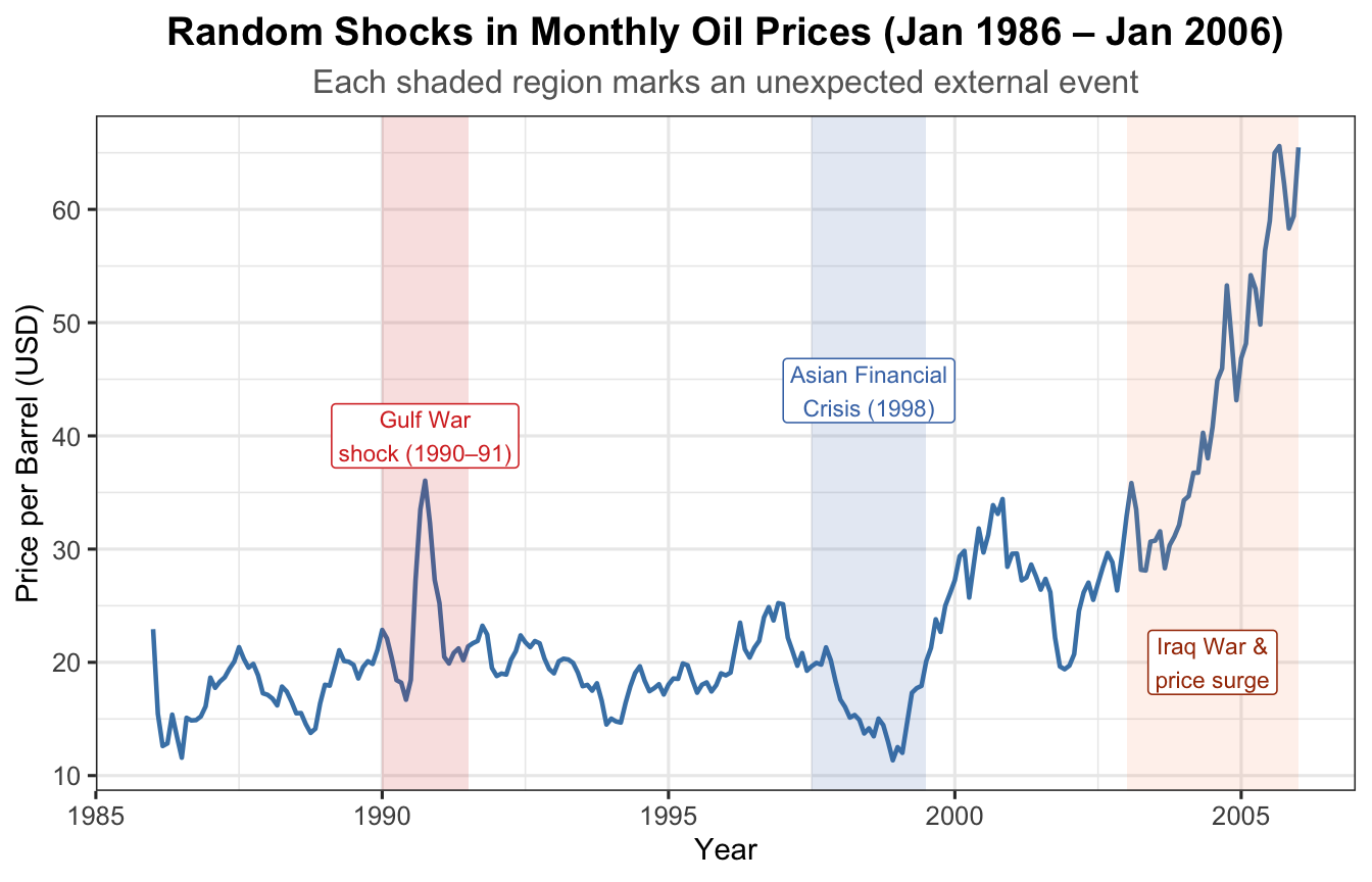 data(oil.price)oil_df <-data.frame(Date =as.numeric(time(oil.price)),Price =as.numeric(oil.price))ggplot(oil_df, aes(x = Date, y = Price)) +geom_line(colour ="steelblue", linewidth =0.8) +annotate("rect", xmin =1990, xmax =1991.5,ymin =-Inf, ymax =Inf, alpha =0.15, fill ="#d73027") +annotate("label", x =1990.75, y =40,label ="Gulf War\nshock (1990–91)",colour ="#d73027", fill ="white", size =3, label.size =0.3) +annotate("rect", xmin =1997.5, xmax =1999.5,ymin =-Inf, ymax =Inf, alpha =0.15, fill ="#4575b4") +annotate("label", x =1998.5, y =44,label ="Asian Financial\nCrisis (1998)",colour ="#4575b4", fill ="white", size =3, label.size =0.3) +annotate("rect", xmin =2003, xmax =2006,ymin =-Inf, ymax =Inf, alpha =0.12, fill ="#fc8d59") +annotate("label", x =2004.5, y =20,label ="Iraq War &\nprice surge",colour ="#a63603", fill ="white", size =3, label.size =0.3) +labs(title ="Random Shocks in Monthly Oil Prices (Jan 1986 – Jan 2006)",subtitle ="Each shaded region marks an unexpected external event",x ="Year", y ="Price per Barrel (USD)") +theme_ts()