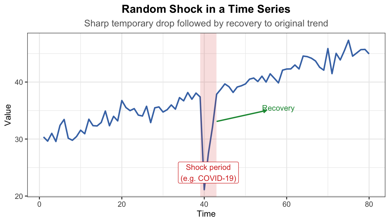 t_sh <-1:80trend_sh <-30+0.2* t_shnoise_sh <-rnorm(80, 0, 1.2)shock <-rep(0, 80)shock[40] <--18# sudden sharp downward shockshock[41] <--10shock[42] <--4# gradual recoveryy_sh <- trend_sh + shock + noise_shdf_sh <-data.frame(t = t_sh, y = y_sh)ggplot(df_sh, aes(x = t, y = y)) +geom_line(colour ="#4575b4", linewidth =0.9) +annotate("rect", xmin =39, xmax =43, ymin =-Inf, ymax =Inf,alpha =0.15, fill ="#d73027") +annotate("label", x =41, y =min(y_sh) +3,label ="Shock period\n(e.g. COVID-19)", colour ="#d73027",fill ="white", size =3.5, label.size =0.3) +annotate("segment", x =43, xend =55, y = y_sh[42] +1, yend =35,arrow =arrow(length =unit(0.15, "cm")), colour ="#1a9641",linewidth =0.8) +annotate("text", x =58, y =35.5, label ="Recovery",colour ="#1a9641", size =3.5) +labs(title ="Random Shock in a Time Series",subtitle ="Sharp temporary drop followed by recovery to original trend",x ="Time", y ="Value") +theme_ts()