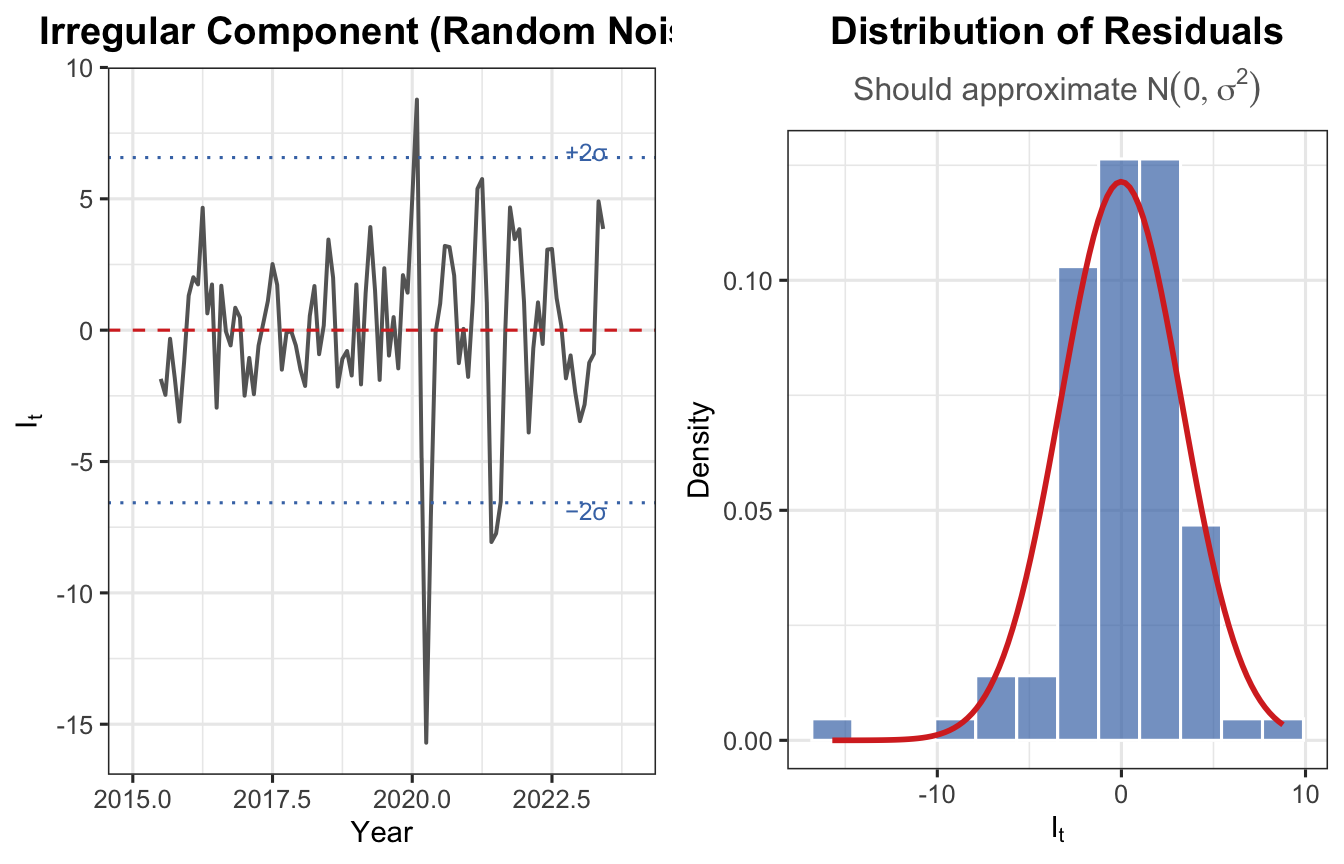 Random errors are expected to be \(I_t \sim N(0, \sigma^2)\) and uncorrelated across time.