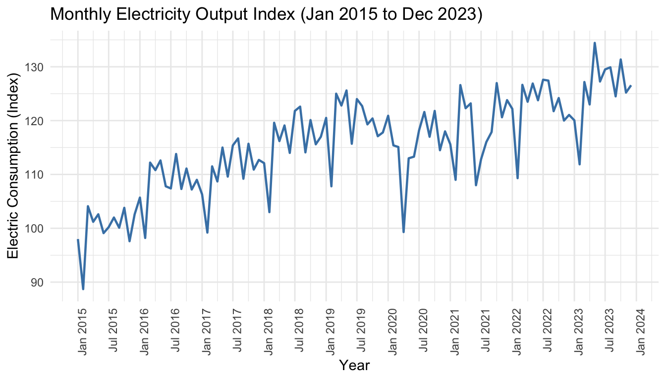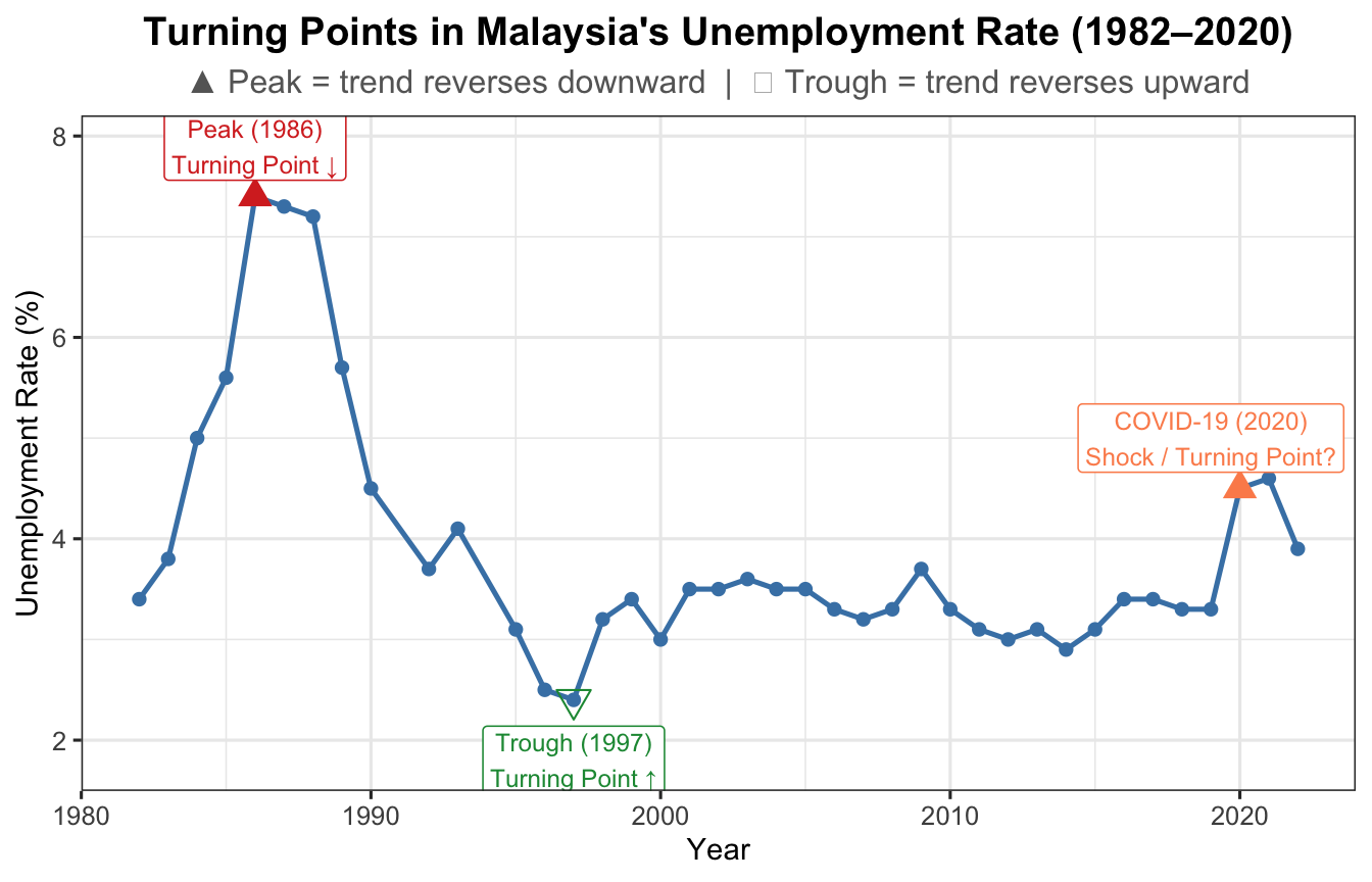 unrate <-read.csv("data/employment.csv")df_u <-data.frame(Year =as.numeric(format(as.Date(unrate$date), "%Y")),u_rate = unrate$u_rate)ggplot(df_u, aes(x = Year, y = u_rate)) +geom_line(colour ="steelblue", linewidth =0.9) +geom_point(size =1.8, colour ="steelblue") +geom_point(data = df_u[df_u$Year ==1986, ],aes(x = Year, y = u_rate),colour ="#d73027", size =4, shape =17) +annotate("label", x =1986, y = df_u$u_rate[df_u$Year ==1986] +0.5,label ="Peak (1986)\nTurning Point ↓",colour ="#d73027", fill ="white", size =3.2, label.size =0.3) +geom_point(data = df_u[df_u$Year ==1997, ],aes(x = Year, y = u_rate),colour ="#1a9641", size =4, shape =25) +annotate("label", x =1997, y = df_u$u_rate[df_u$Year ==1997] -0.6,label ="Trough (1997)\nTurning Point ↑",colour ="#1a9641", fill ="white", size =3.2, label.size =0.3) +geom_point(data = df_u[df_u$Year ==2020, ],aes(x = Year, y = u_rate),colour ="#fc8d59", size =4, shape =17) +annotate("label", x =2019, y = df_u$u_rate[df_u$Year ==2020] +0.5,label ="COVID-19 (2020)\nShock / Turning Point?",colour ="#fc8d59", fill ="white", size =3.2, label.size =0.3) +labs(title ="Turning Points in Malaysia's Unemployment Rate (1982–2020)",subtitle ="▲ Peak = trend reverses downward | ▽ Trough = trend reverses upward",x ="Year", y ="Unemployment Rate (%)") +theme_ts()