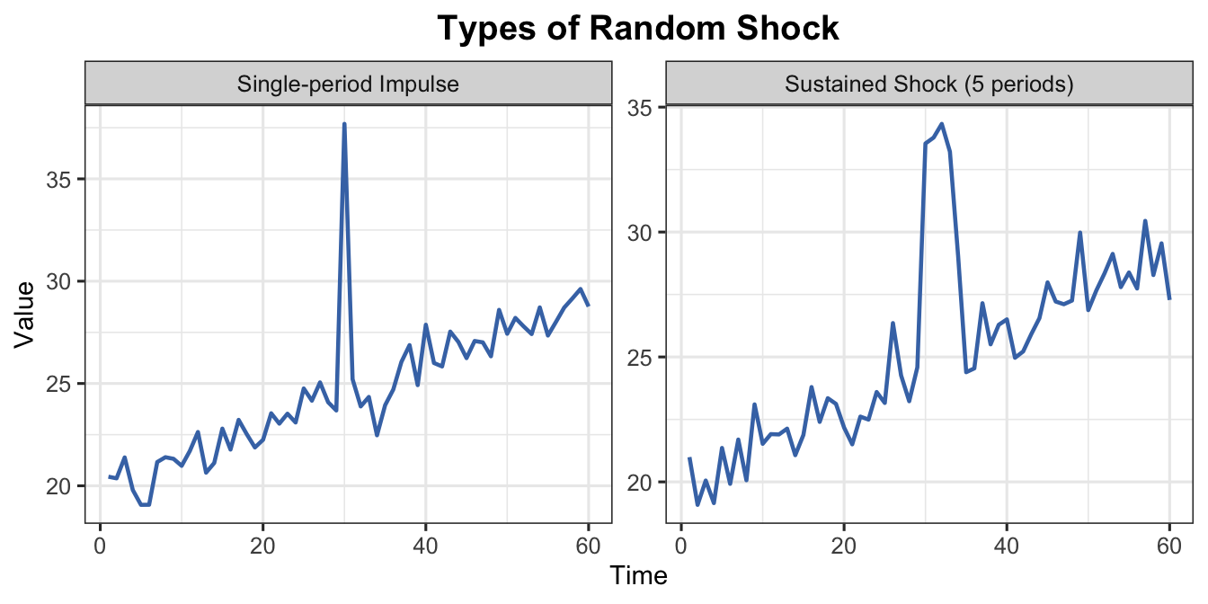 t2 <-1:60base <-20+0.15* t2# Single-period impulsey_imp <- base +rnorm(60, 0, 0.8)y_imp[30] <- y_imp[30] +12# Multi-period sustained shock (e.g. supply chain disruption for 5 months)shock_sus <-rep(0, 60)shock_sus[30:34] <-c(8, 10, 9, 7, 4)y_sus <- base + shock_sus +rnorm(60, 0, 0.8)df_imp <-data.frame(t = t2, y = y_imp, type ="Single-period Impulse")df_sus <-data.frame(t = t2, y = y_sus, type ="Sustained Shock (5 periods)")df_cmp <-rbind(df_imp, df_sus)ggplot(df_cmp, aes(x = t, y = y)) +geom_line(colour ="#4575b4", linewidth =0.8) +facet_wrap(~type, scales ="free_y") +labs(title ="Types of Random Shock",x ="Time", y ="Value") +theme_ts()