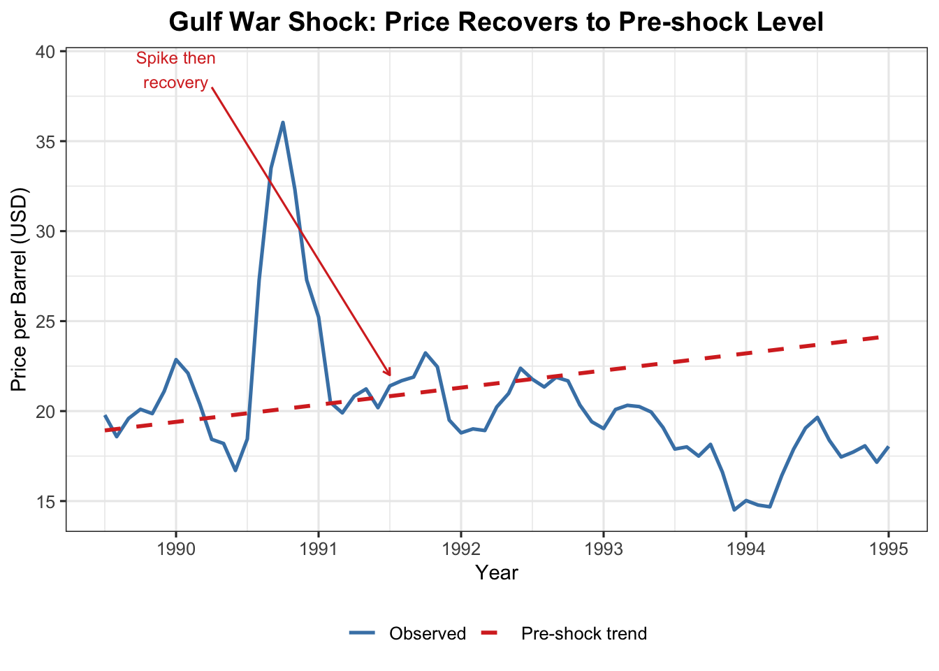 oil_sub <- oil_df[oil_df$Date >=1989.5& oil_df$Date <=1995, ]lm_pre <-lm(Price ~ Date, data = oil_df[oil_df$Date <1990, ])oil_sub$trend <-predict(lm_pre, newdata =data.frame(Date = oil_sub$Date))ggplot(oil_sub, aes(x = Date)) +geom_line(aes(y = Price, colour ="Observed"), linewidth =0.9) +geom_line(aes(y = trend, colour ="Pre-shock trend"),linetype ="dashed", linewidth =1) +annotate("segment", x =1990.25, xend =1991.5, y =38, yend =22,arrow =arrow(length =unit(0.15, "cm")), colour ="#d73027") +annotate("text", x =1990, y =39, label ="Spike then\nrecovery",colour ="#d73027", size =3.2) +scale_colour_manual(values =c("Observed"="steelblue","Pre-shock trend"="#d73027")) +labs(title ="Gulf War Shock: Price Recovers to Pre-shock Level",x ="Year", y ="Price per Barrel (USD)", colour =NULL) +theme_ts()