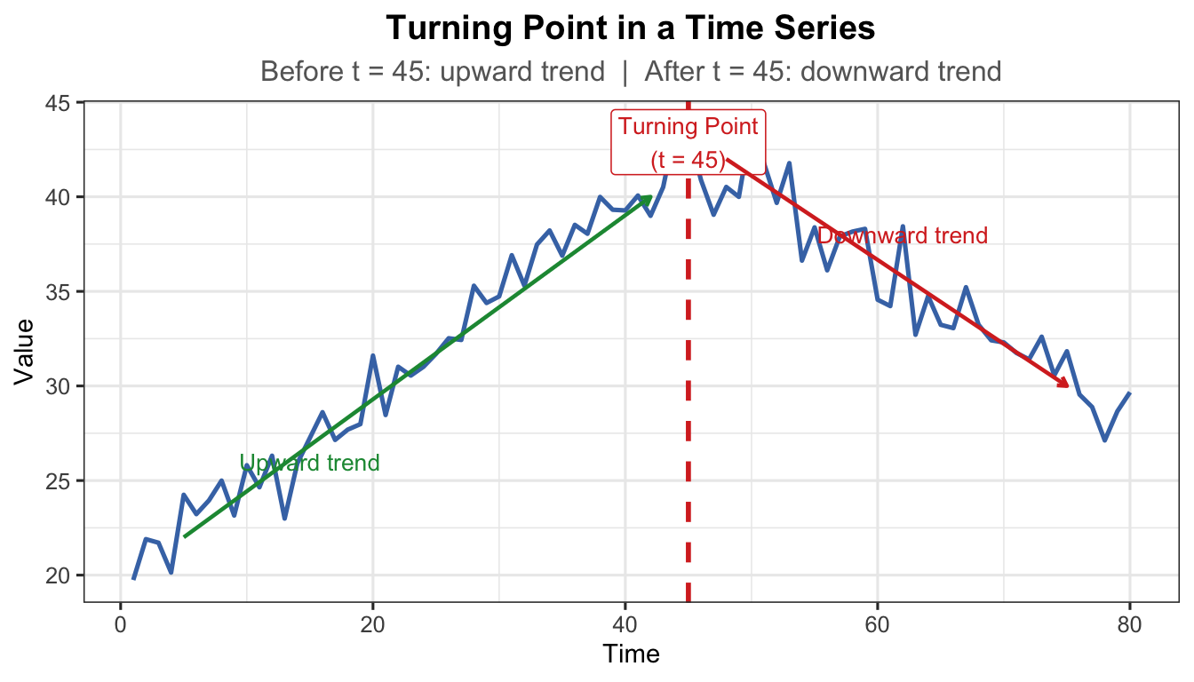 t_tp <-1:80# Before turning point: upward; after: downwardy_tp <-ifelse(t_tp <=45,20+0.5* t_tp,20+0.5*45-0.4* (t_tp -45)) +rnorm(80, 0, 1.2)df_tp <-data.frame(t = t_tp, y = y_tp)ggplot(df_tp, aes(x = t, y = y)) +geom_line(colour ="#4575b4", linewidth =0.9) +geom_vline(xintercept =45, linetype ="dashed", colour ="#d73027",linewidth =1) +annotate("label", x =45, y =max(y_tp) -1,label ="Turning Point\n(t = 45)", colour ="#d73027",fill ="white", size =3.5, label.size =0.3) +annotate("segment", x =5, xend =42, y =22, yend =40,arrow =arrow(length =unit(0.15, "cm")),colour ="#1a9641", linewidth =0.8) +annotate("text", x =15, y =26, label ="Upward trend",colour ="#1a9641", size =3.5) +annotate("segment", x =48, xend =75, y =42, yend =30,arrow =arrow(length =unit(0.15, "cm")),colour ="#d73027", linewidth =0.8) +annotate("text", x =62, y =38, label ="Downward trend",colour ="#d73027", size =3.5) +labs(title ="Turning Point in a Time Series",subtitle ="Before t = 45: upward trend | After t = 45: downward trend",x ="Time", y ="Value") +theme_ts()