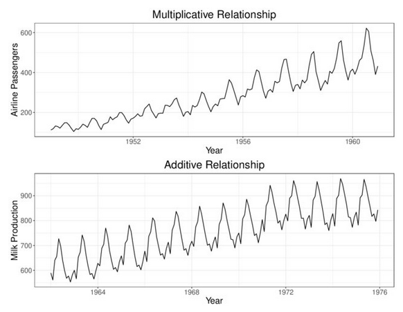 (a) Example 1 — Airline passengers (top): seasonal swings widen as the series grows → multiplicative. Milk production (bottom): seasonal swings remain roughly constant → additive.