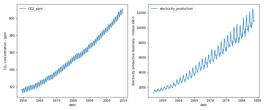 (b) Example 2 — CO₂ concentration (left) and Australian electricity production (right): both exhibit seasonal fluctuations that grow proportionally with the level → multiplicative.