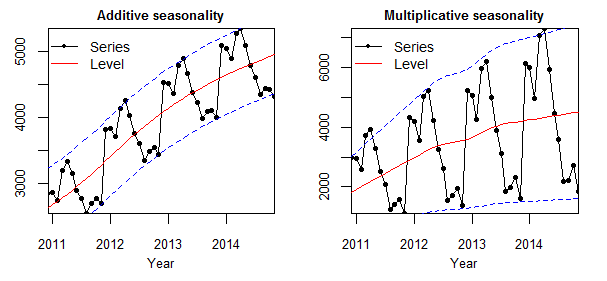 (c) Example 3 — Additive seasonality (left): the band of variation around the trend (dashed lines) stays constant. Multiplicative seasonality (right): the band widens as the level rises.