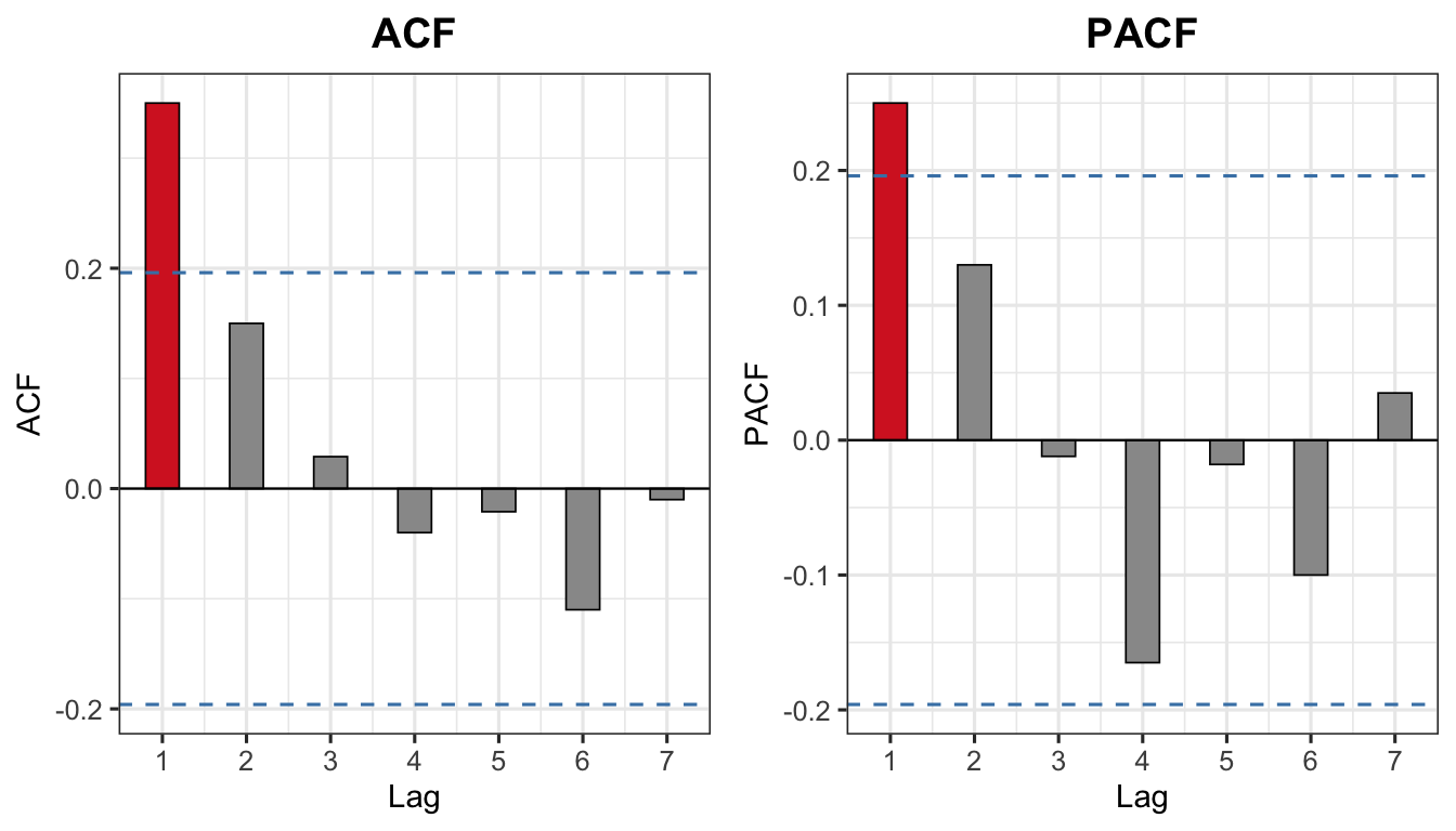 | PACF | Lag 1 (non-seasonal) | AR(1) → \(p = 1\) |