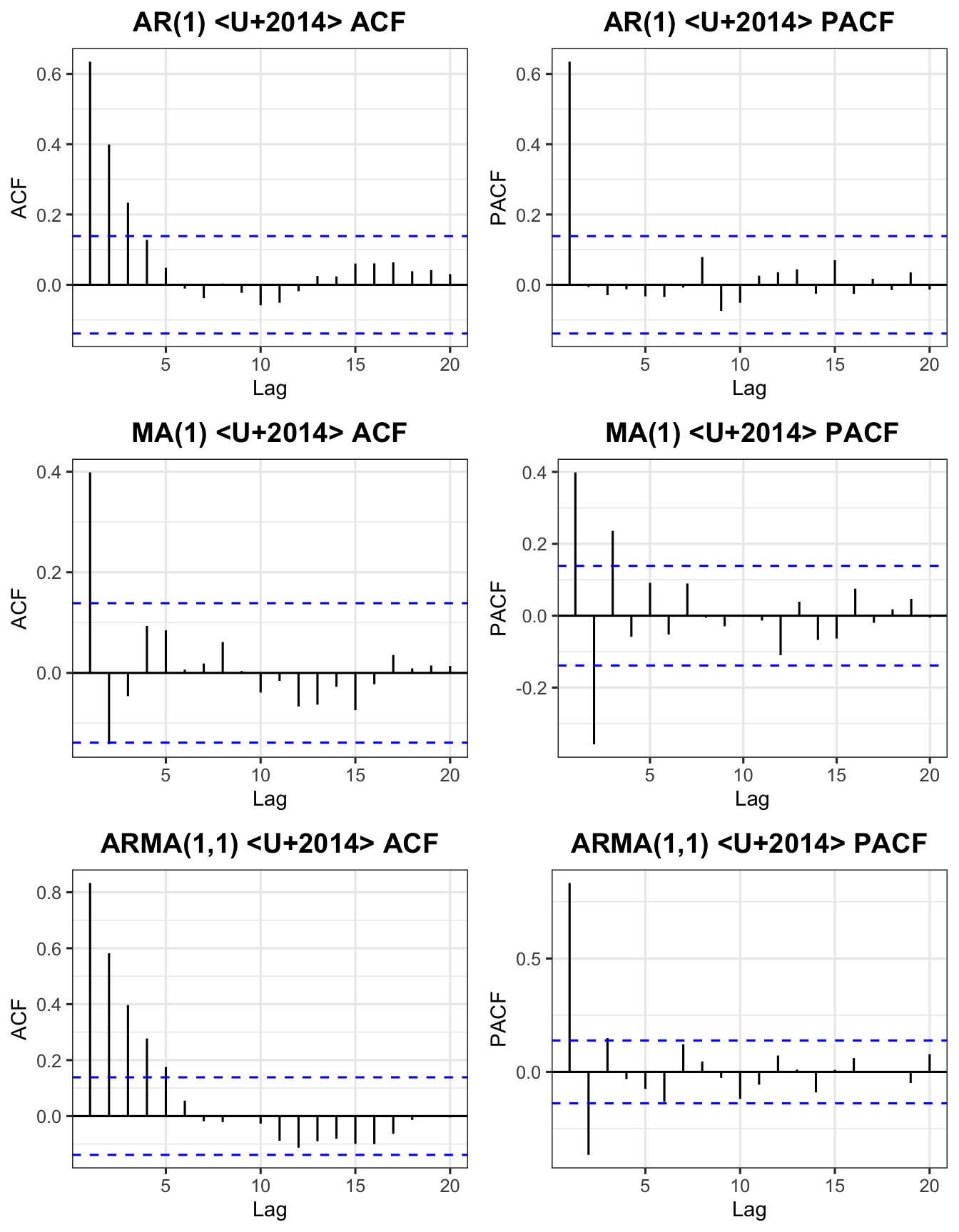 ARMA(\(p,q\)) combines AR order \(p\) and MA order \(q\):
