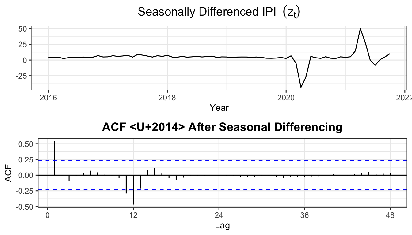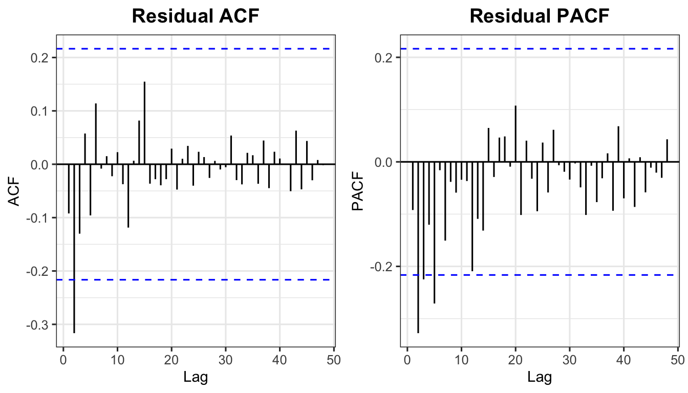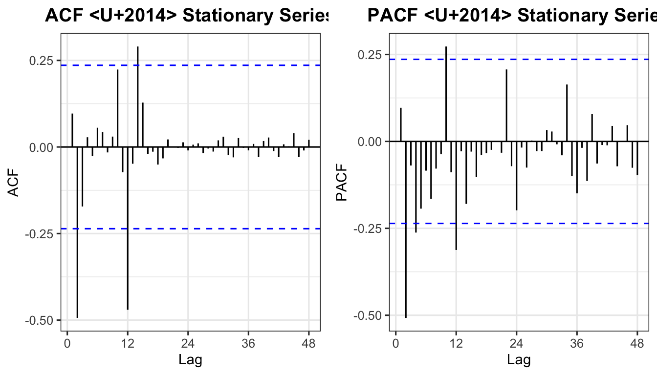 | Seasonal | Peaks at seasonal lags (\(s\), \(2s\), …) | Peaks at seasonal lags |