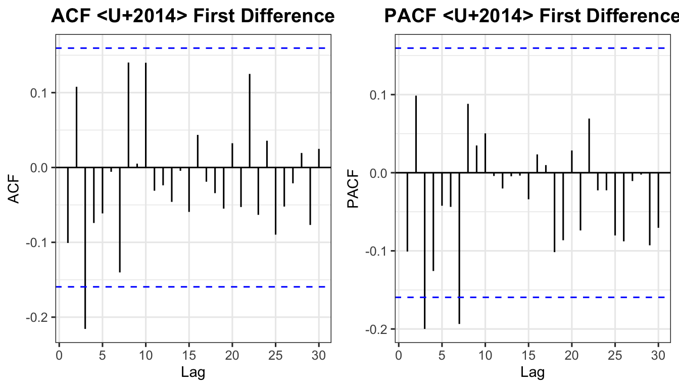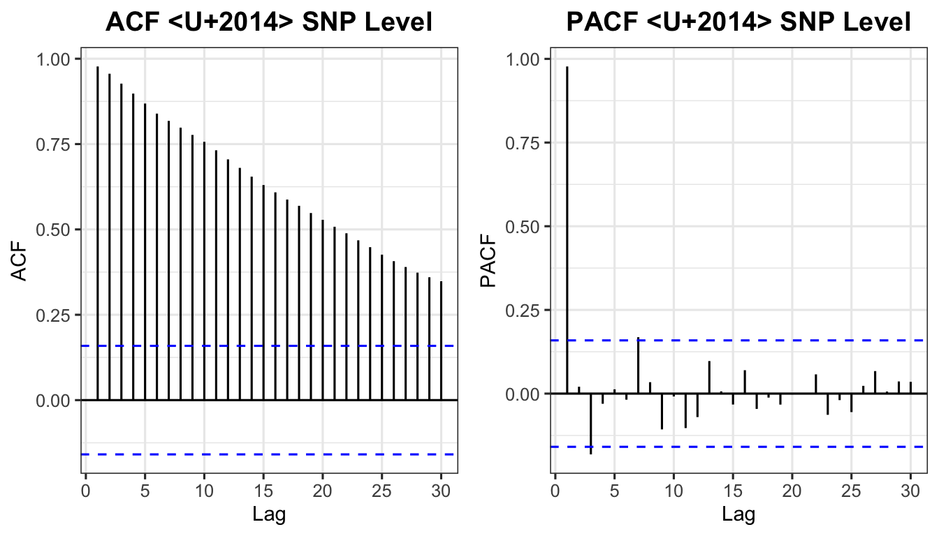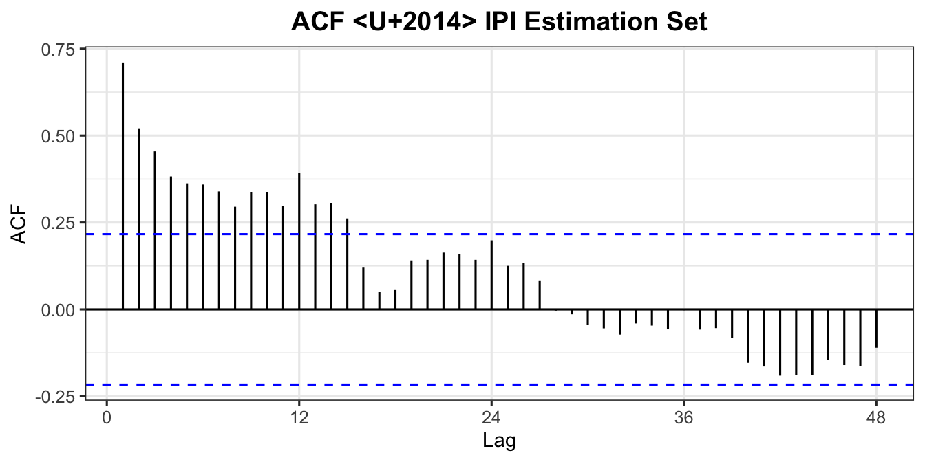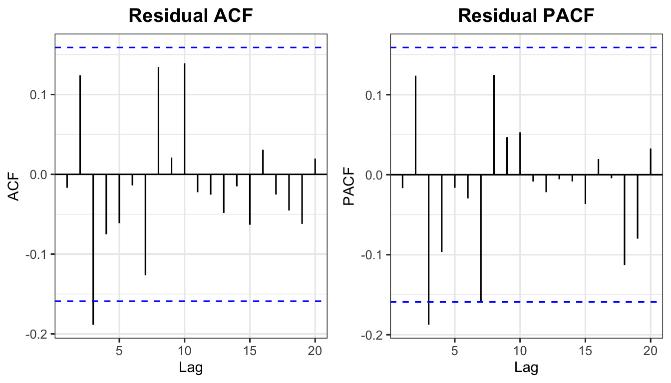 | Seasonal | Peaks at seasonal lags (\(s\), \(2s\), …) | Peaks at seasonal lags |