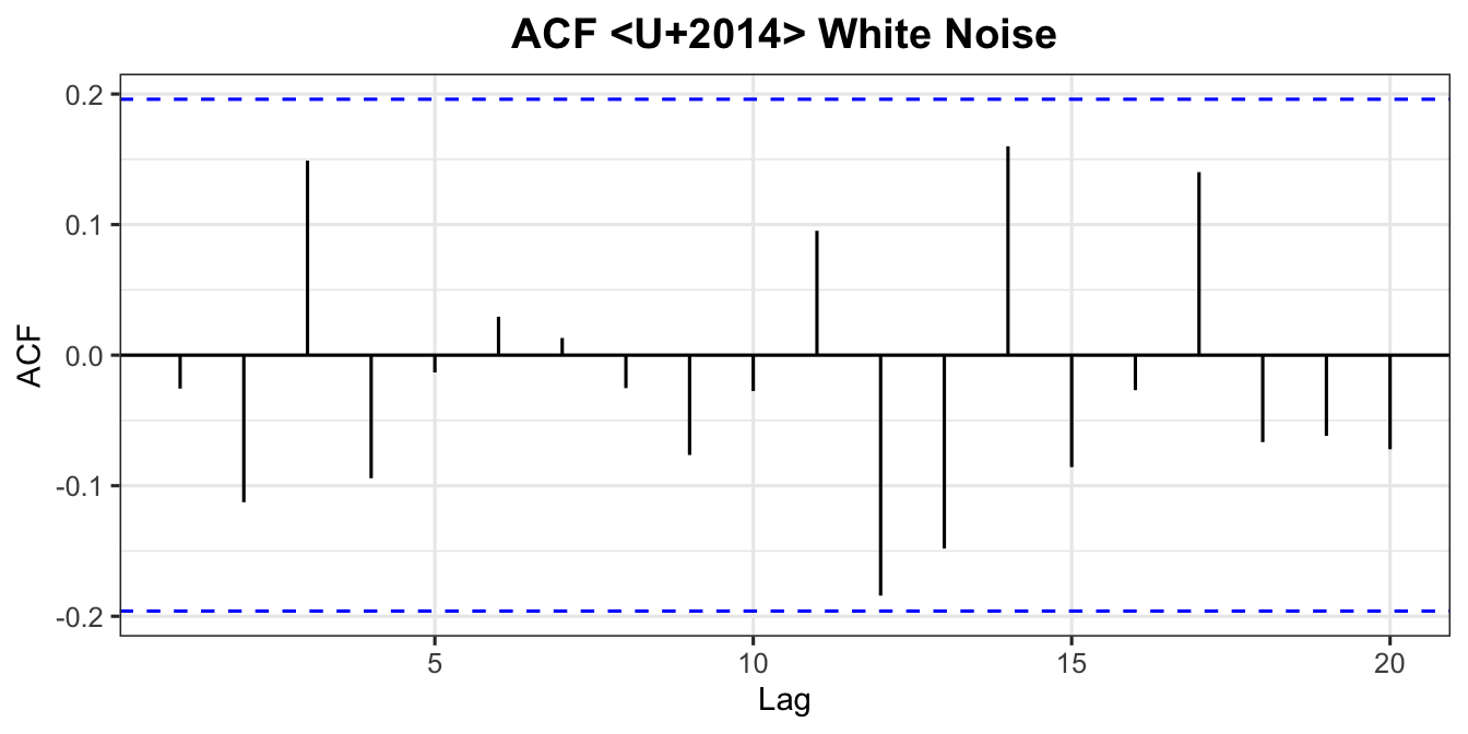 All autocorrelations at lags \(k > 0\) are zero. A white noise ACF shows all spikes within the confidence bounds.