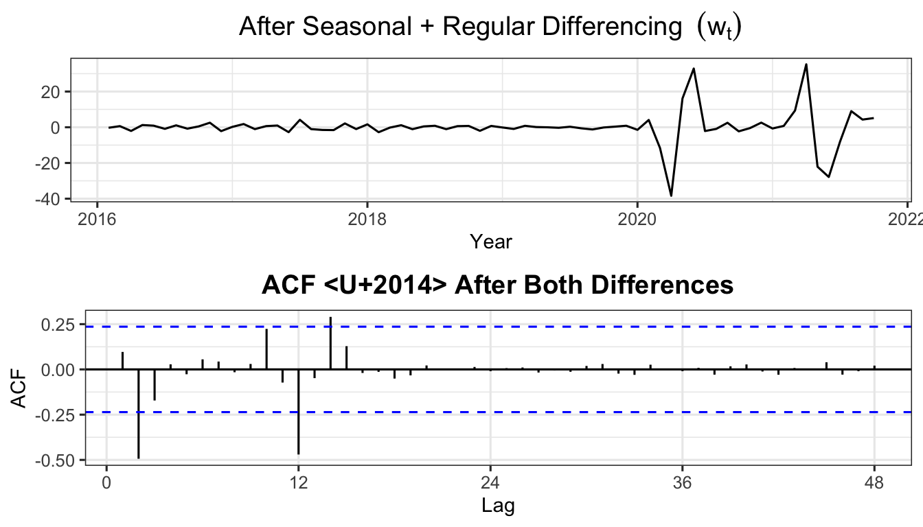 If \(z_t\) is still not stationary, apply regular differencing: \(w_t = z_t - z_{t-1}\).
