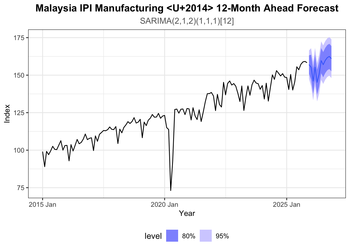 labs(title = "Malaysia IPI Manufacturing — 12-Month Ahead Forecast",